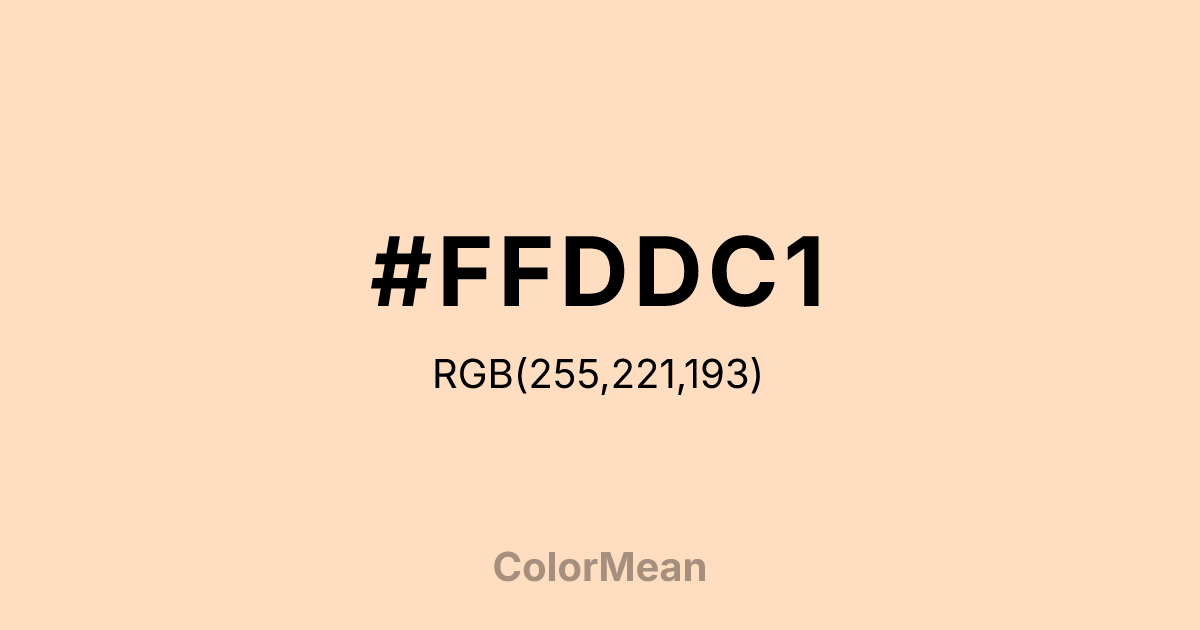#FFDDC1 RGB value is (255, 221, 193). The hex color red value is 255, green is 221, and blue is 193. Its HSL format shows a hue of 27°, saturation of 100 percent, and lightness of 88 percent. The CMYK process values are 0 percent, 13 percent, 24 percent, 0 percent.