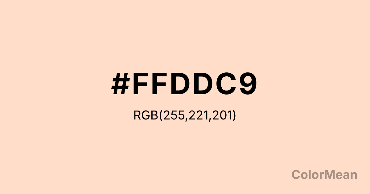 #FFDDC9 RGB value is (255, 221, 201). The hex color red value is 255, green is 221, and blue is 201. Its HSL format shows a hue of 22°, saturation of 100 percent, and lightness of 89 percent. The CMYK process values are 0 percent, 13 percent, 21 percent, 0 percent.