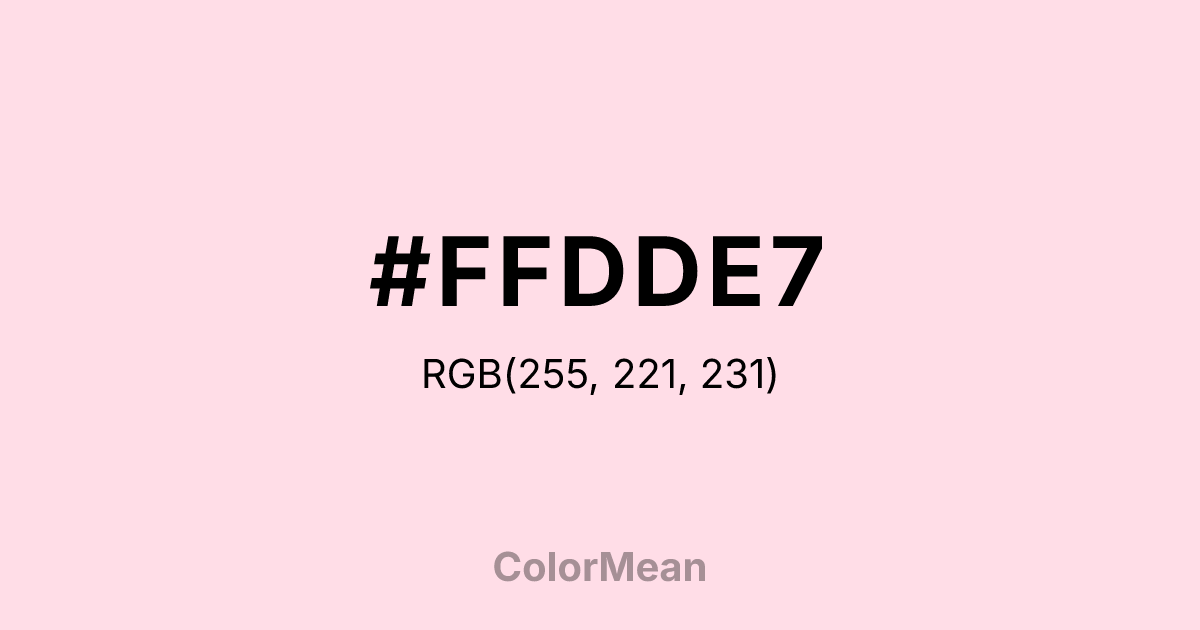 #FFDDE7 RGB value is (255, 221, 231). The hex color red value is 255, green is 221, and blue is 231. Its HSL format shows a hue of 342°, saturation of 100 percent, and lightness of 93 percent. The CMYK process values are 0 percent, 13 percent, 9 percent, 0 percent.