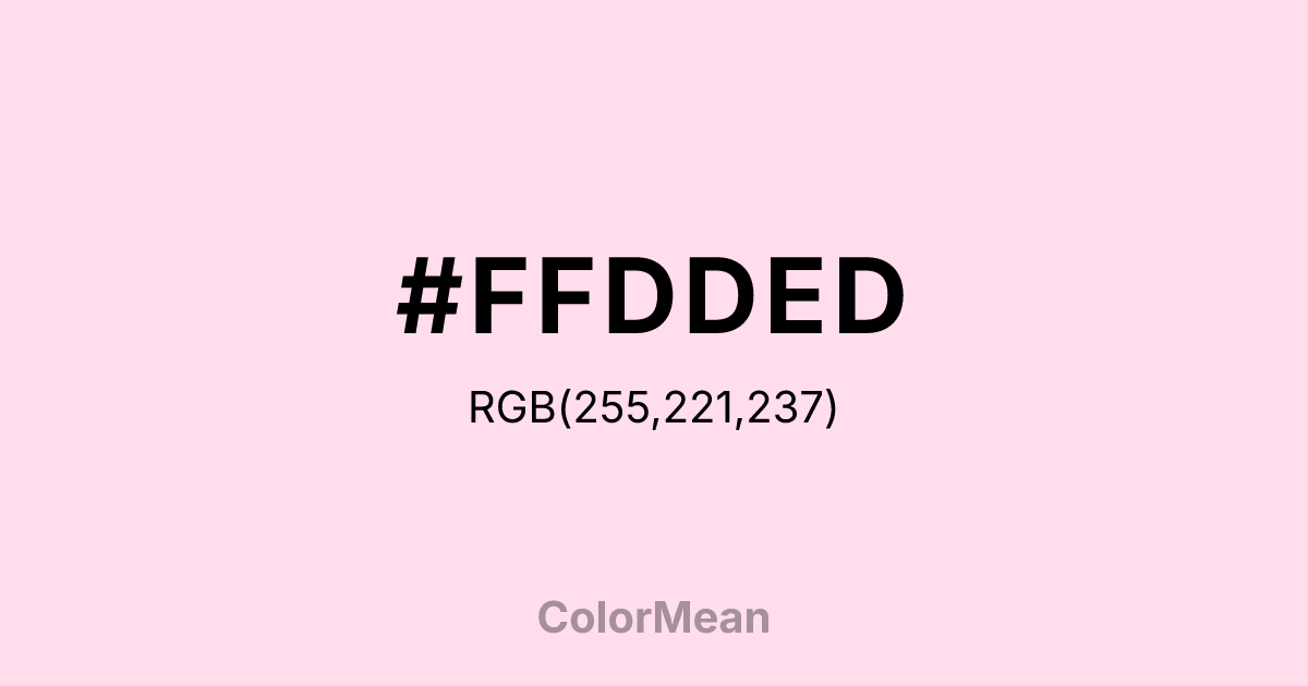 #FFDDED RGB value is (255, 221, 237). The hex color red value is 255, green is 221, and blue is 237. Its HSL format shows a hue of 332°, saturation of 100 percent, and lightness of 93 percent. The CMYK process values are 0 percent, 13 percent, 7 percent, 0 percent.