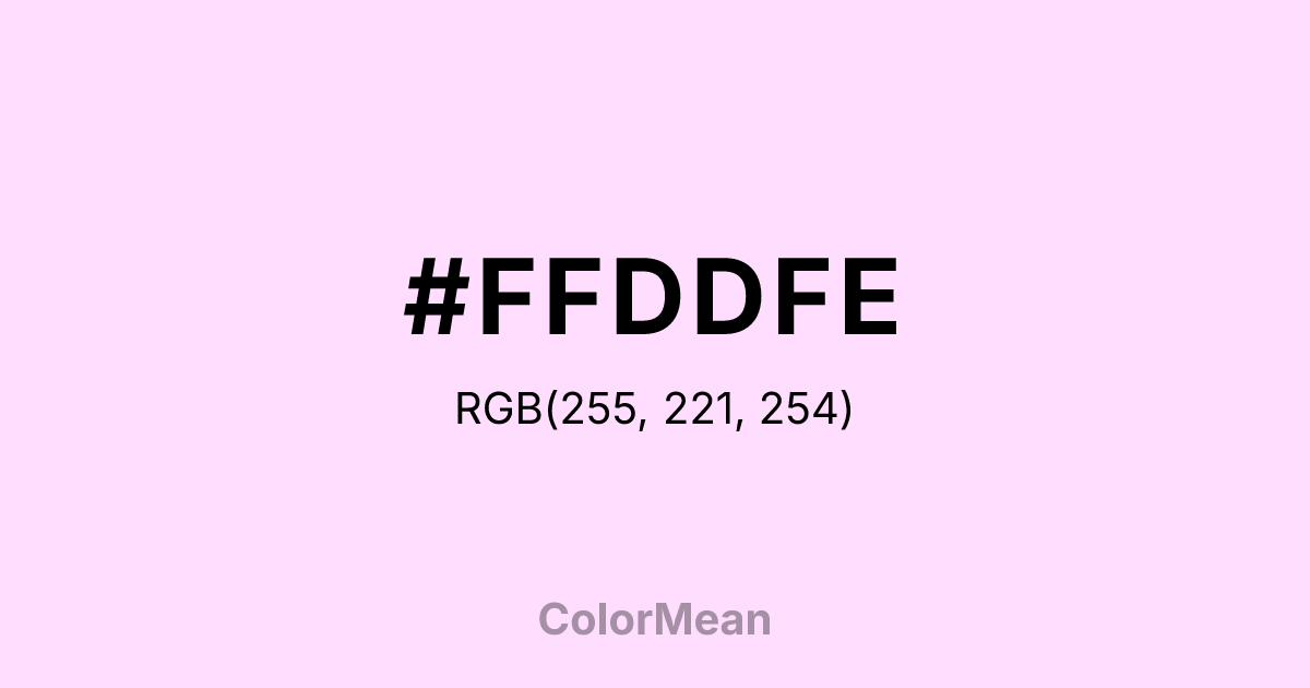 #FFDDFE RGB value is (255, 221, 254). The hex color red value is 255, green is 221, and blue is 254. Its HSL format shows a hue of 302°, saturation of 100 percent, and lightness of 93 percent. The CMYK process values are 0 percent, 13 percent, 0 percent, 0 percent.