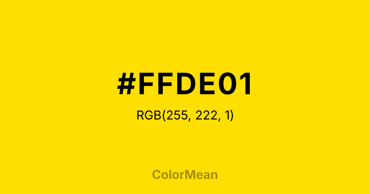 #FFDE01 RGB value is (255, 222, 1). The hex color red value is 255, green is 222, and blue is 1. Its HSL format shows a hue of 52°, saturation of 100 percent, and lightness of 50 percent. The CMYK process values are 0 percent, 13 percent, 100 percent, 0 percent.