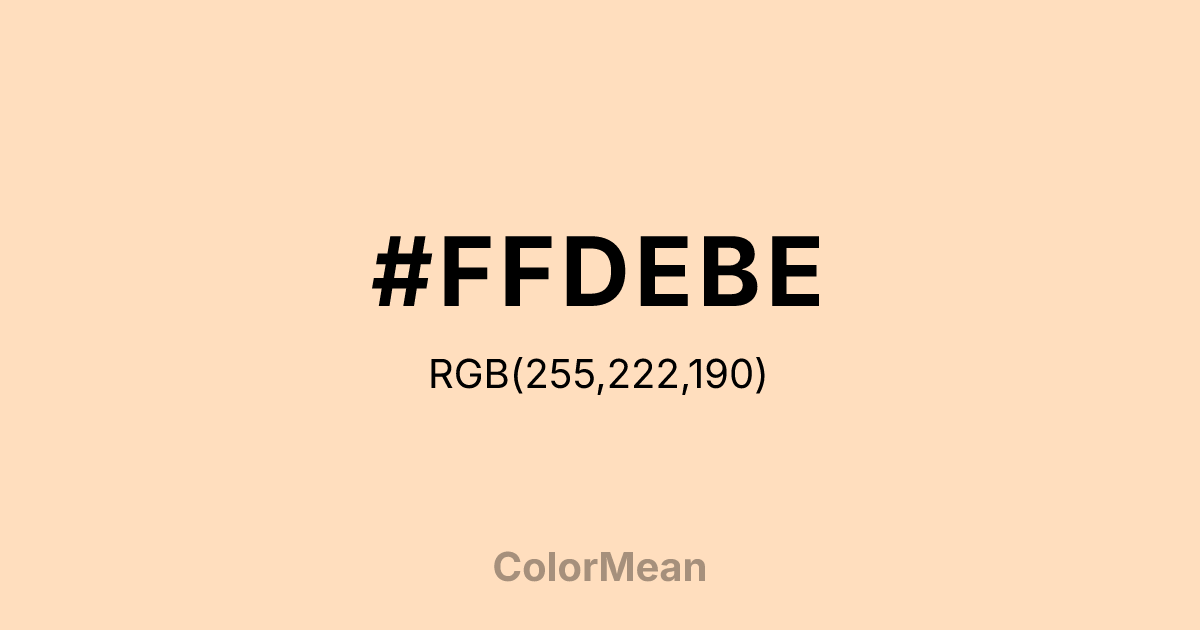 #FFDEBE RGB value is (255, 222, 190). The hex color red value is 255, green is 222, and blue is 190. Its HSL format shows a hue of 30°, saturation of 100 percent, and lightness of 87 percent. The CMYK process values are 0 percent, 13 percent, 25 percent, 0 percent.