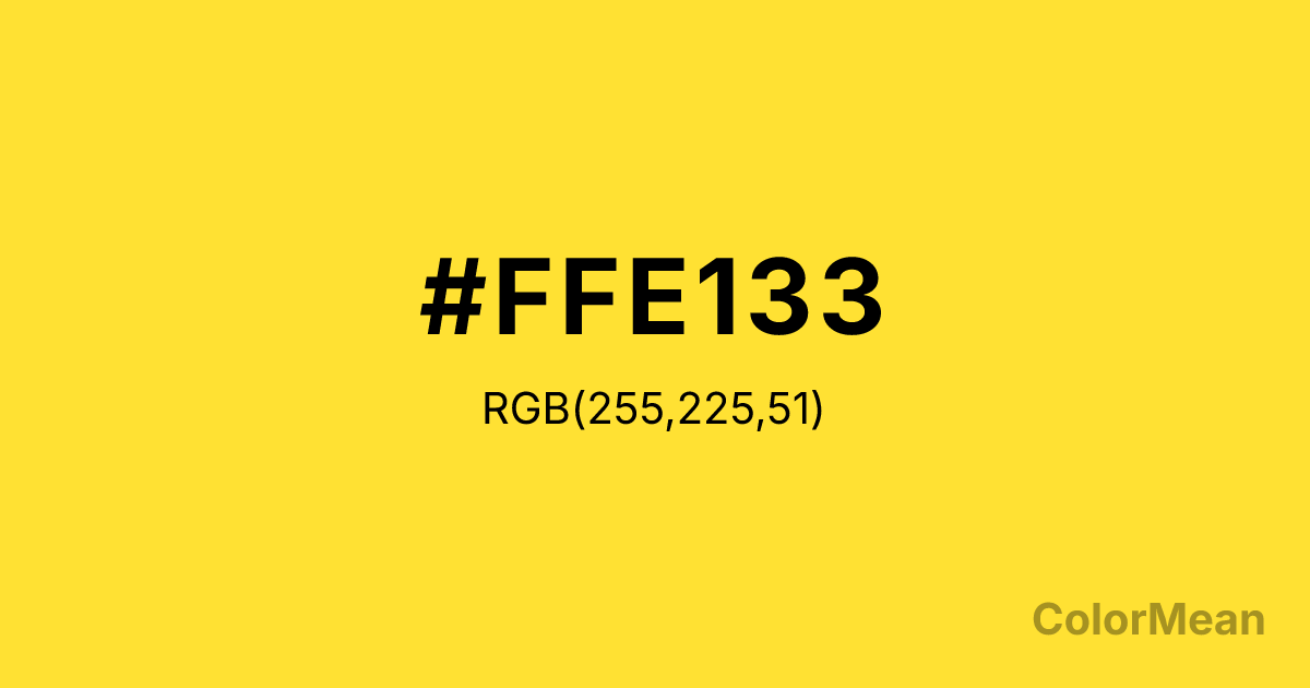 #FFE133 RGB value is (255, 225, 51). The hex color red value is 255, green is 225, and blue is 51. Its HSL format shows a hue of 51°, saturation of 100 percent, and lightness of 60 percent. The CMYK process values are 0 percent, 12 percent, 80 percent, 0 percent.