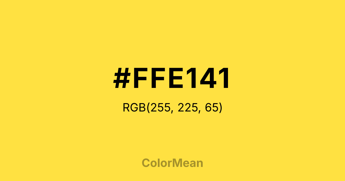 #FFE141 RGB value is (255, 225, 65). The hex color red value is 255, green is 225, and blue is 65. Its HSL format shows a hue of 51°, saturation of 100 percent, and lightness of 63 percent. The CMYK process values are 0 percent, 12 percent, 75 percent, 0 percent.