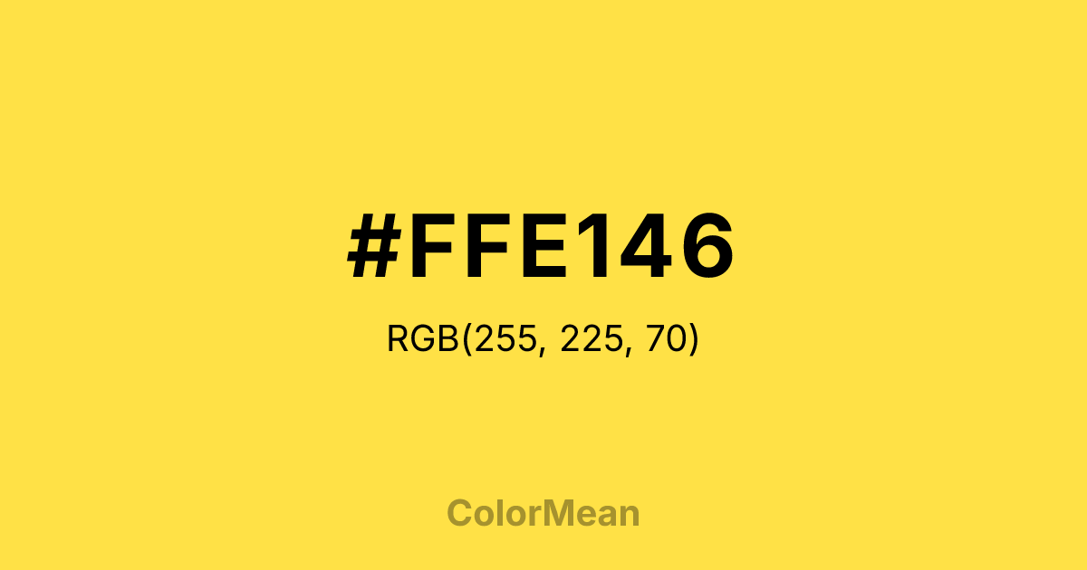 #FFE146 RGB value is (255, 225, 70). The hex color red value is 255, green is 225, and blue is 70. Its HSL format shows a hue of 50°, saturation of 100 percent, and lightness of 64 percent. The CMYK process values are 0 percent, 12 percent, 73 percent, 0 percent.