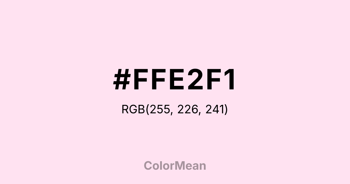 #FFE2F1 RGB value is (255, 226, 241). The hex color red value is 255, green is 226, and blue is 241. Its HSL format shows a hue of 329°, saturation of 100 percent, and lightness of 94 percent. The CMYK process values are 0 percent, 11 percent, 5 percent, 0 percent.
