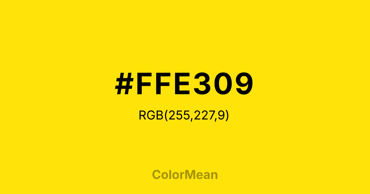 #FFE309 RGB value is (255, 227, 9). The hex color red value is 255, green is 227, and blue is 9. Its HSL format shows a hue of 53°, saturation of 100 percent, and lightness of 52 percent. The CMYK process values are 0 percent, 11 percent, 96 percent, 0 percent.