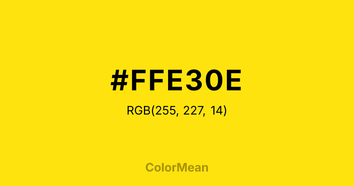 #FFE30E RGB value is (255, 227, 14). The hex color red value is 255, green is 227, and blue is 14. Its HSL format shows a hue of 53°, saturation of 100 percent, and lightness of 53 percent. The CMYK process values are 0 percent, 11 percent, 95 percent, 0 percent.