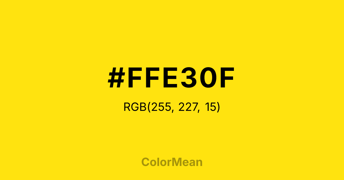 #FFE30F RGB value is (255, 227, 15). The hex color red value is 255, green is 227, and blue is 15. Its HSL format shows a hue of 53°, saturation of 100 percent, and lightness of 53 percent. The CMYK process values are 0 percent, 11 percent, 94 percent, 0 percent.