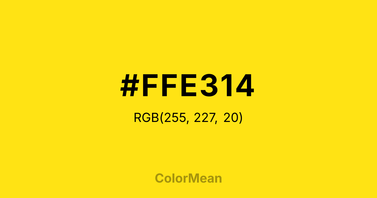 #FFE314 RGB value is (255, 227, 20). The hex color red value is 255, green is 227, and blue is 20. Its HSL format shows a hue of 53°, saturation of 100 percent, and lightness of 54 percent. The CMYK process values are 0 percent, 11 percent, 92 percent, 0 percent.