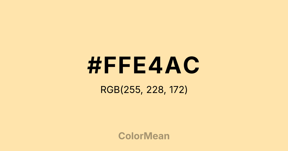 #FFE4AC RGB value is (255, 228, 172). The hex color red value is 255, green is 228, and blue is 172. Its HSL format shows a hue of 40°, saturation of 100 percent, and lightness of 84 percent. The CMYK process values are 0 percent, 11 percent, 33 percent, 0 percent.