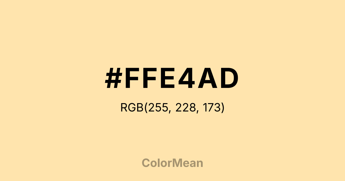#FFE4AD RGB value is (255, 228, 173). The hex color red value is 255, green is 228, and blue is 173. Its HSL format shows a hue of 40°, saturation of 100 percent, and lightness of 84 percent. The CMYK process values are 0 percent, 11 percent, 32 percent, 0 percent.