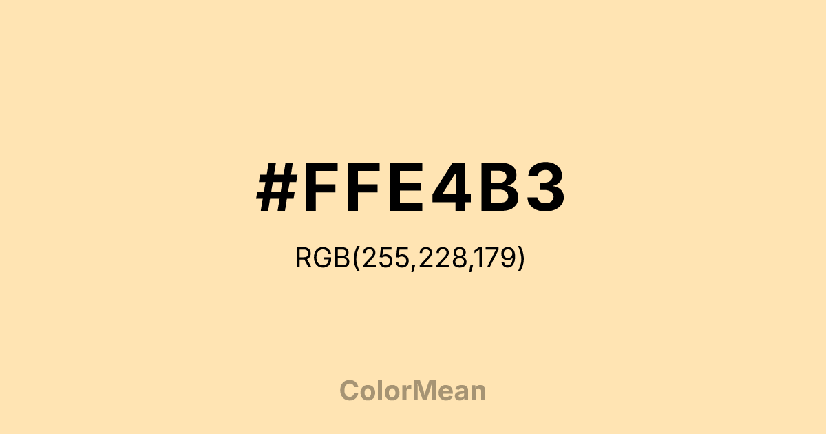 #FFE4B3 RGB value is (255, 228, 179). The hex color red value is 255, green is 228, and blue is 179. Its HSL format shows a hue of 39°, saturation of 100 percent, and lightness of 85 percent. The CMYK process values are 0 percent, 11 percent, 30 percent, 0 percent.