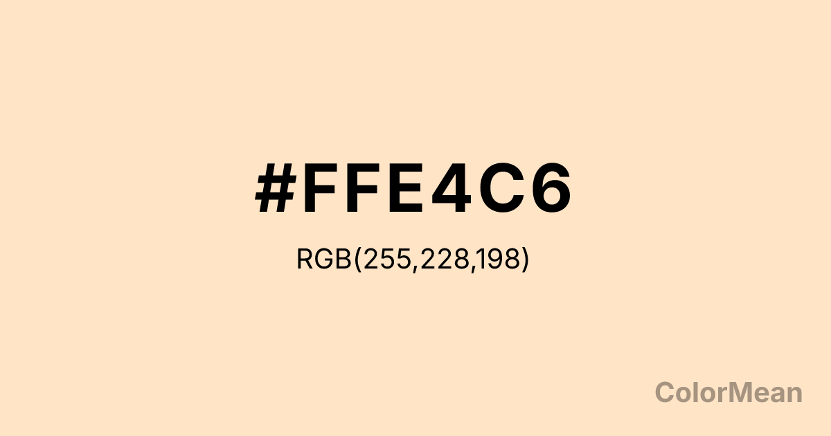 #FFE4C6 RGB value is (255, 228, 198). The hex color red value is 255, green is 228, and blue is 198. Its HSL format shows a hue of 32°, saturation of 100 percent, and lightness of 89 percent. The CMYK process values are 0 percent, 11 percent, 22 percent, 0 percent.