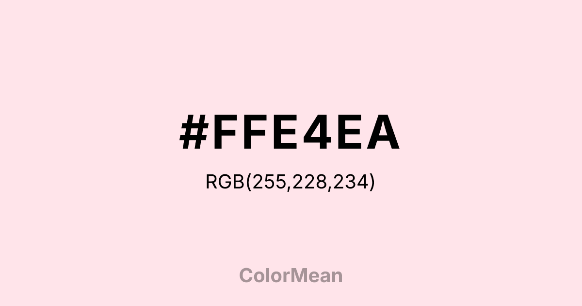 #FFE4EA RGB value is (255, 228, 234). The hex color red value is 255, green is 228, and blue is 234. Its HSL format shows a hue of 347°, saturation of 100 percent, and lightness of 95 percent. The CMYK process values are 0 percent, 11 percent, 8 percent, 0 percent.
