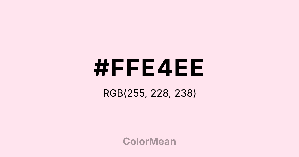 #FFE4EE RGB value is (255, 228, 238). The hex color red value is 255, green is 228, and blue is 238. Its HSL format shows a hue of 338°, saturation of 100 percent, and lightness of 95 percent. The CMYK process values are 0 percent, 11 percent, 7 percent, 0 percent.