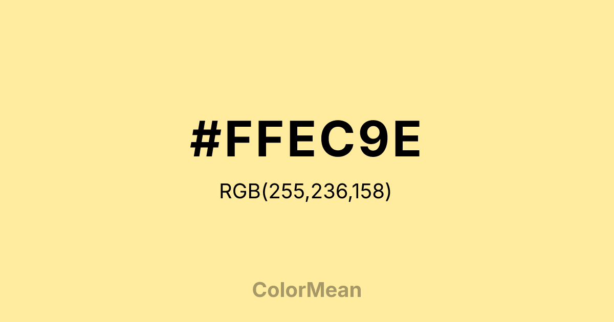 #FFEC9E RGB value is (255, 236, 158). The hex color red value is 255, green is 236, and blue is 158. Its HSL format shows a hue of 48°, saturation of 100 percent, and lightness of 81 percent. The CMYK process values are 0 percent, 7 percent, 38 percent, 0 percent.