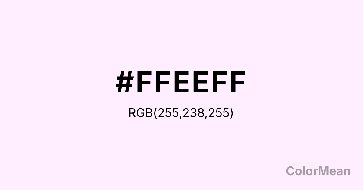 #FFEEFF RGB value is (255, 238, 255). The hex color red value is 255, green is 238, and blue is 255. Its HSL format shows a hue of 300°, saturation of 100 percent, and lightness of 97 percent. The CMYK process values are 0 percent, 7 percent, 0 percent, 0 percent.