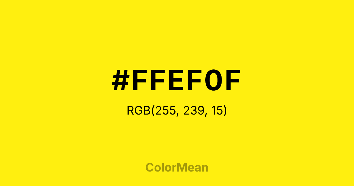 #FFEF0F RGB value is (255, 239, 15). The hex color red value is 255, green is 239, and blue is 15. Its HSL format shows a hue of 56°, saturation of 100 percent, and lightness of 53 percent. The CMYK process values are 0 percent, 6 percent, 94 percent, 0 percent.
