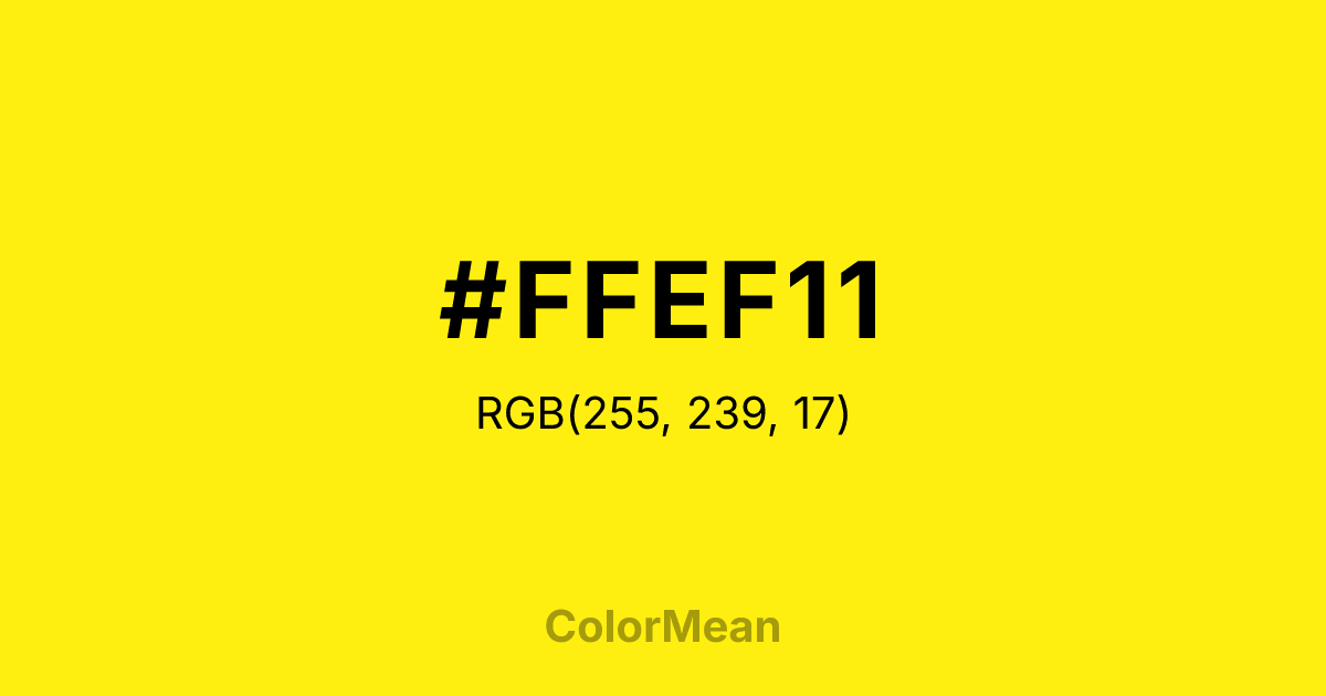 #FFEF11 RGB value is (255, 239, 17). The hex color red value is 255, green is 239, and blue is 17. Its HSL format shows a hue of 56°, saturation of 100 percent, and lightness of 53 percent. The CMYK process values are 0 percent, 6 percent, 93 percent, 0 percent.