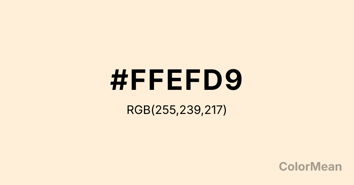#FFEFD9 RGB value is (255, 239, 217). The hex color red value is 255, green is 239, and blue is 217. Its HSL format shows a hue of 35°, saturation of 100 percent, and lightness of 93 percent. The CMYK process values are 0 percent, 6 percent, 15 percent, 0 percent.