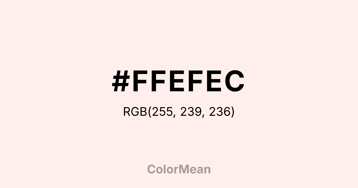 #FFEFEC RGB value is (255, 239, 236). The hex color red value is 255, green is 239, and blue is 236. Its HSL format shows a hue of 9°, saturation of 100 percent, and lightness of 96 percent. The CMYK process values are 0 percent, 6 percent, 7 percent, 0 percent.