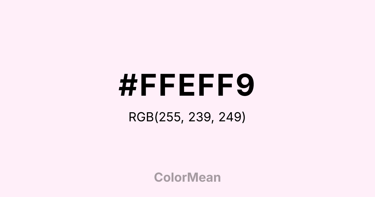 #FFEFF9 RGB value is (255, 239, 249). The hex color red value is 255, green is 239, and blue is 249. Its HSL format shows a hue of 323°, saturation of 100 percent, and lightness of 97 percent. The CMYK process values are 0 percent, 6 percent, 2 percent, 0 percent.