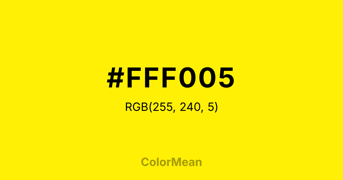 #FFF005 RGB value is (255, 240, 5). The hex color red value is 255, green is 240, and blue is 5. Its HSL format shows a hue of 56°, saturation of 100 percent, and lightness of 51 percent. The CMYK process values are 0 percent, 6 percent, 98 percent, 0 percent.