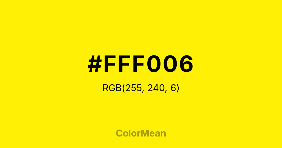 #FFF006 RGB value is (255, 240, 6). The hex color red value is 255, green is 240, and blue is 6. Its HSL format shows a hue of 56°, saturation of 100 percent, and lightness of 51 percent. The CMYK process values are 0 percent, 6 percent, 98 percent, 0 percent.