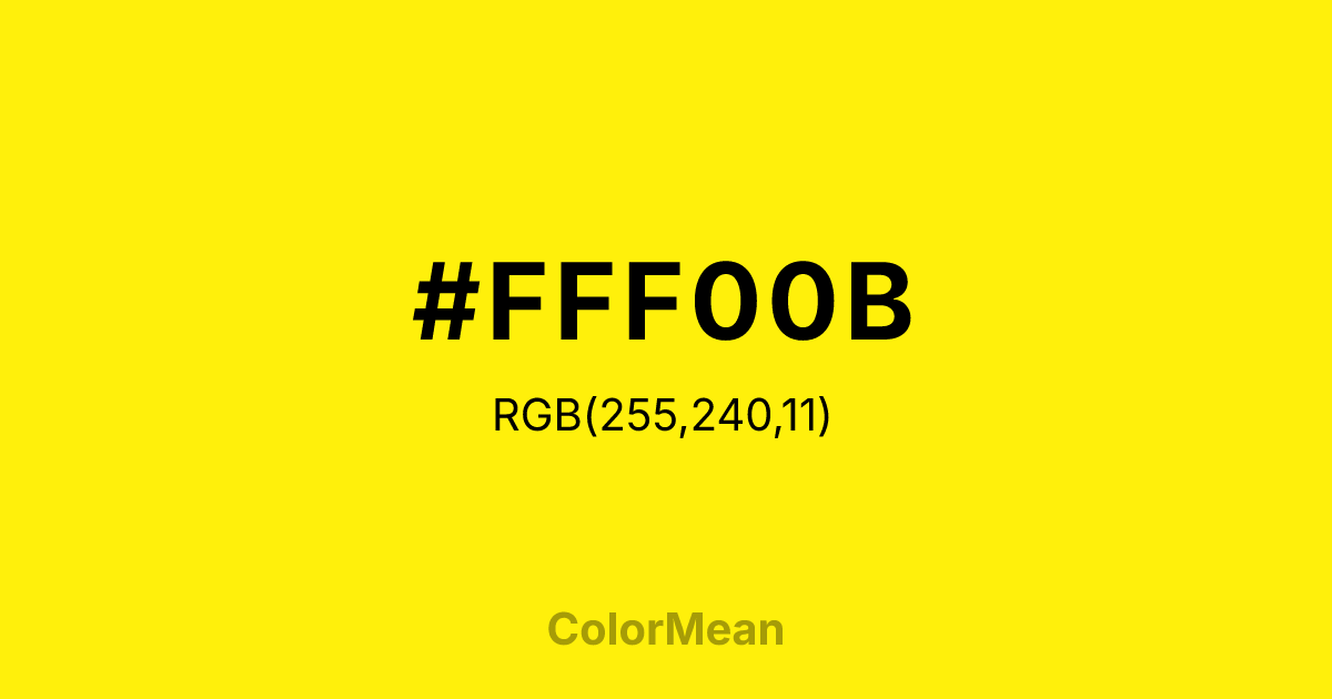 #FFF00B RGB value is (255, 240, 11). The hex color red value is 255, green is 240, and blue is 11. Its HSL format shows a hue of 56°, saturation of 100 percent, and lightness of 52 percent. The CMYK process values are 0 percent, 6 percent, 96 percent, 0 percent.