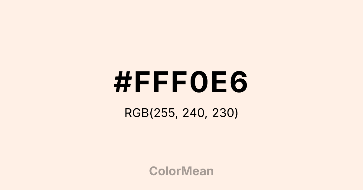 #FFF0E6 RGB value is (255, 240, 230). The hex color red value is 255, green is 240, and blue is 230. Its HSL format shows a hue of 24°, saturation of 100 percent, and lightness of 95 percent. The CMYK process values are 0 percent, 6 percent, 10 percent, 0 percent.