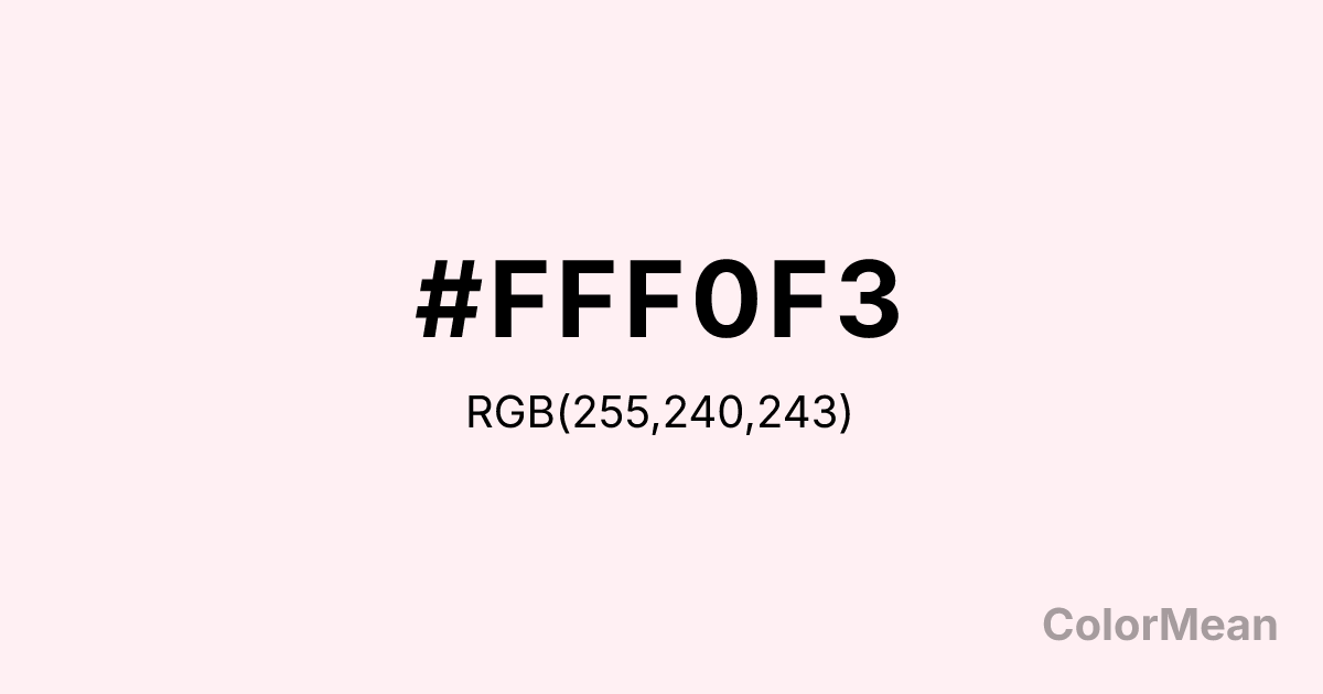 #FFF0F3 RGB value is (255, 240, 243). The hex color red value is 255, green is 240, and blue is 243. Its HSL format shows a hue of 348°, saturation of 100 percent, and lightness of 97 percent. The CMYK process values are 0 percent, 6 percent, 5 percent, 0 percent.