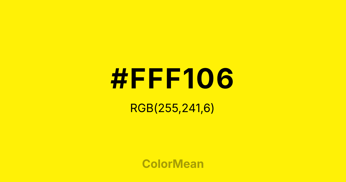 #FFF106 RGB value is (255, 241, 6). The hex color red value is 255, green is 241, and blue is 6. Its HSL format shows a hue of 57°, saturation of 100 percent, and lightness of 51 percent. The CMYK process values are 0 percent, 5 percent, 98 percent, 0 percent.