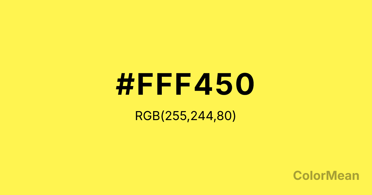 #FFF450 RGB value is (255, 244, 80). The hex color red value is 255, green is 244, and blue is 80. Its HSL format shows a hue of 56°, saturation of 100 percent, and lightness of 66 percent. The CMYK process values are 0 percent, 4 percent, 69 percent, 0 percent.