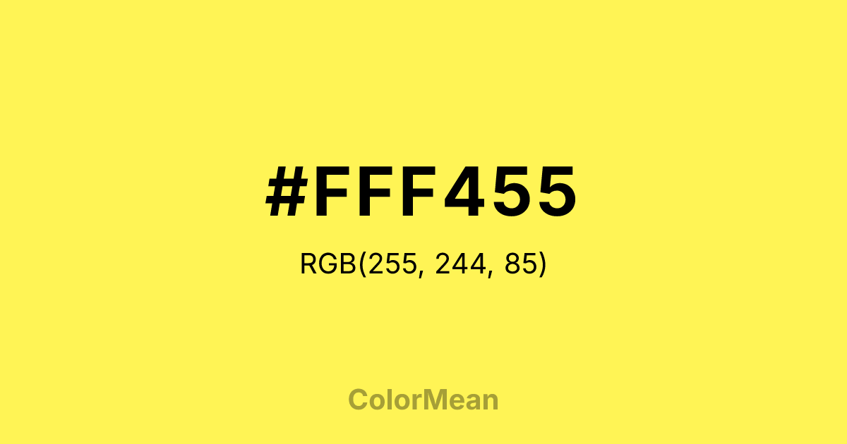 #FFF455 RGB value is (255, 244, 85). The hex color red value is 255, green is 244, and blue is 85. Its HSL format shows a hue of 56°, saturation of 100 percent, and lightness of 67 percent. The CMYK process values are 0 percent, 4 percent, 67 percent, 0 percent.