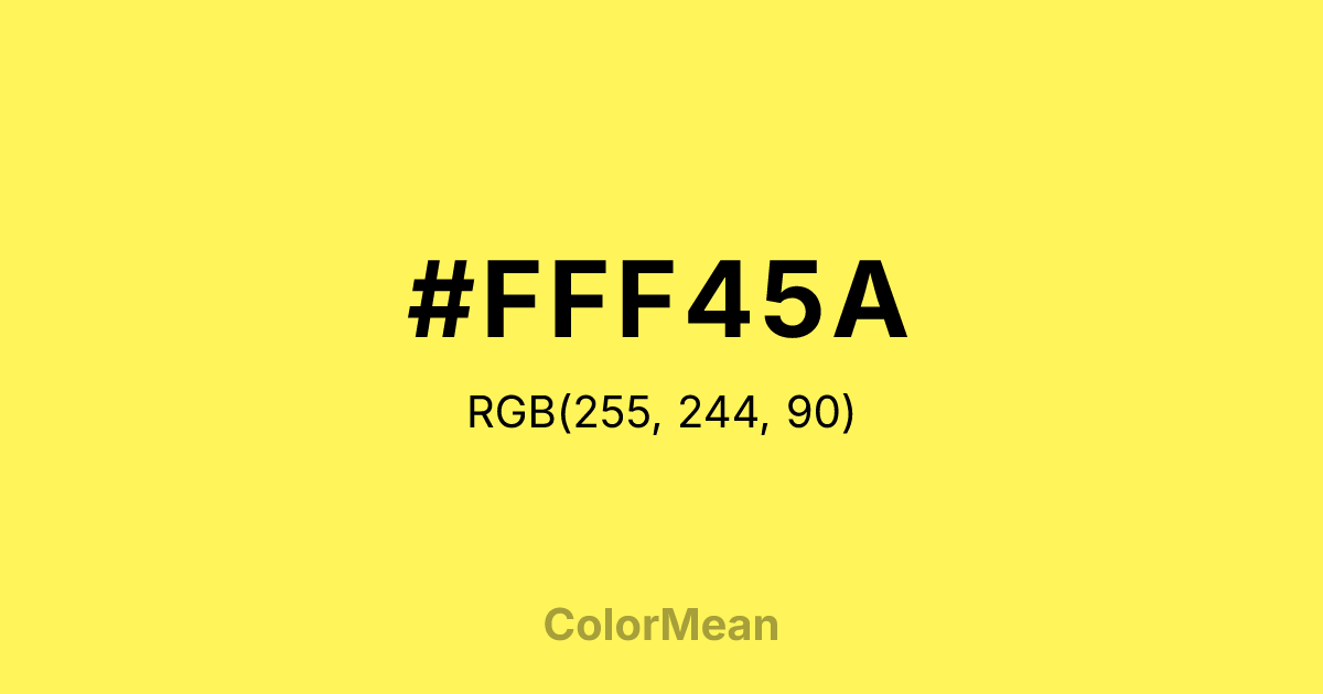 #FFF45A RGB value is (255, 244, 90). The hex color red value is 255, green is 244, and blue is 90. Its HSL format shows a hue of 56°, saturation of 100 percent, and lightness of 68 percent. The CMYK process values are 0 percent, 4 percent, 65 percent, 0 percent.