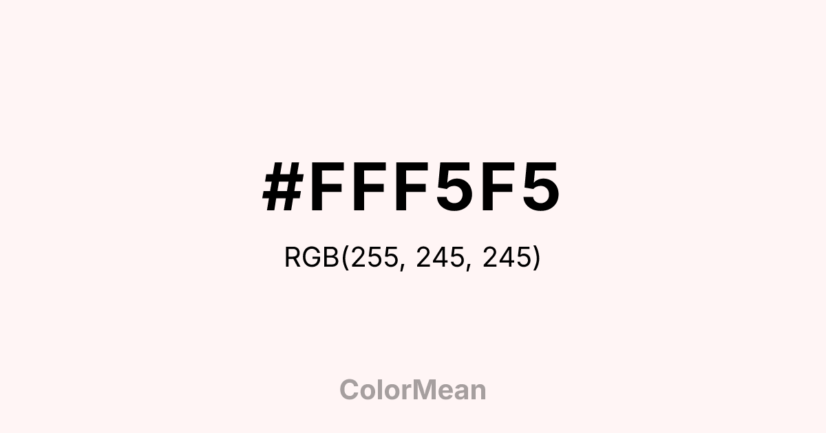 #FFF5F5 RGB value is (255, 245, 245). The hex color red value is 255, green is 245, and blue is 245. Its HSL format shows a hue of 0°, saturation of 100 percent, and lightness of 98 percent. The CMYK process values are 0 percent, 4 percent, 4 percent, 0 percent.