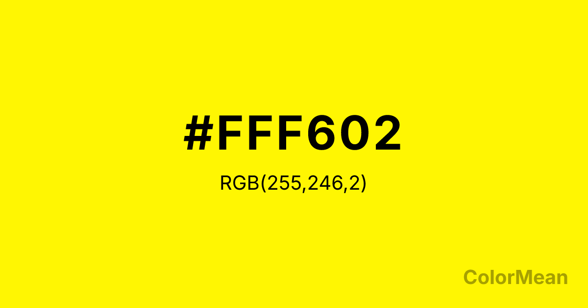 #FFF602 RGB value is (255, 246, 2). The hex color red value is 255, green is 246, and blue is 2. Its HSL format shows a hue of 58°, saturation of 100 percent, and lightness of 50 percent. The CMYK process values are 0 percent, 4 percent, 99 percent, 0 percent.