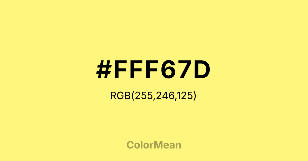 #FFF67D RGB value is (255, 246, 125). The hex color red value is 255, green is 246, and blue is 125. Its HSL format shows a hue of 56°, saturation of 100 percent, and lightness of 75 percent. The CMYK process values are 0 percent, 4 percent, 51 percent, 0 percent.