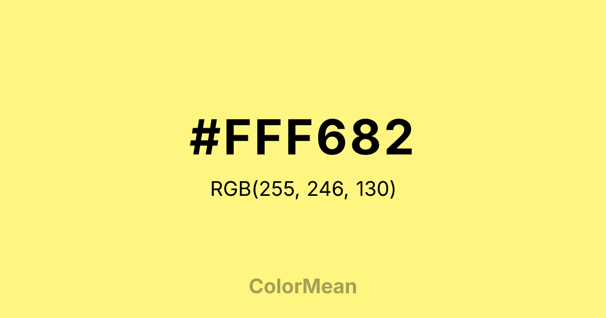 #FFF682 RGB value is (255, 246, 130). The hex color red value is 255, green is 246, and blue is 130. Its HSL format shows a hue of 56°, saturation of 100 percent, and lightness of 75 percent. The CMYK process values are 0 percent, 4 percent, 49 percent, 0 percent.