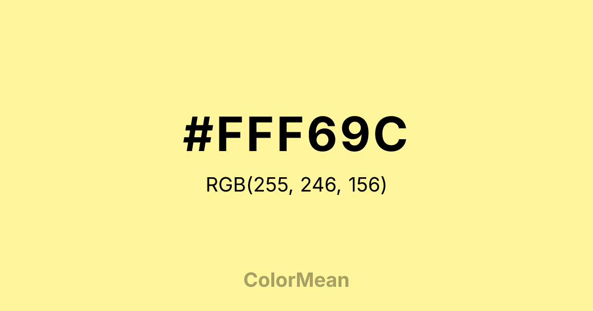 #FFF69C RGB value is (255, 246, 156). The hex color red value is 255, green is 246, and blue is 156. Its HSL format shows a hue of 55°, saturation of 100 percent, and lightness of 81 percent. The CMYK process values are 0 percent, 4 percent, 39 percent, 0 percent.