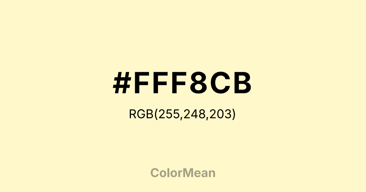 #FFF8CB RGB value is (255, 248, 203). The hex color red value is 255, green is 248, and blue is 203. Its HSL format shows a hue of 52°, saturation of 100 percent, and lightness of 90 percent. The CMYK process values are 0 percent, 3 percent, 20 percent, 0 percent.