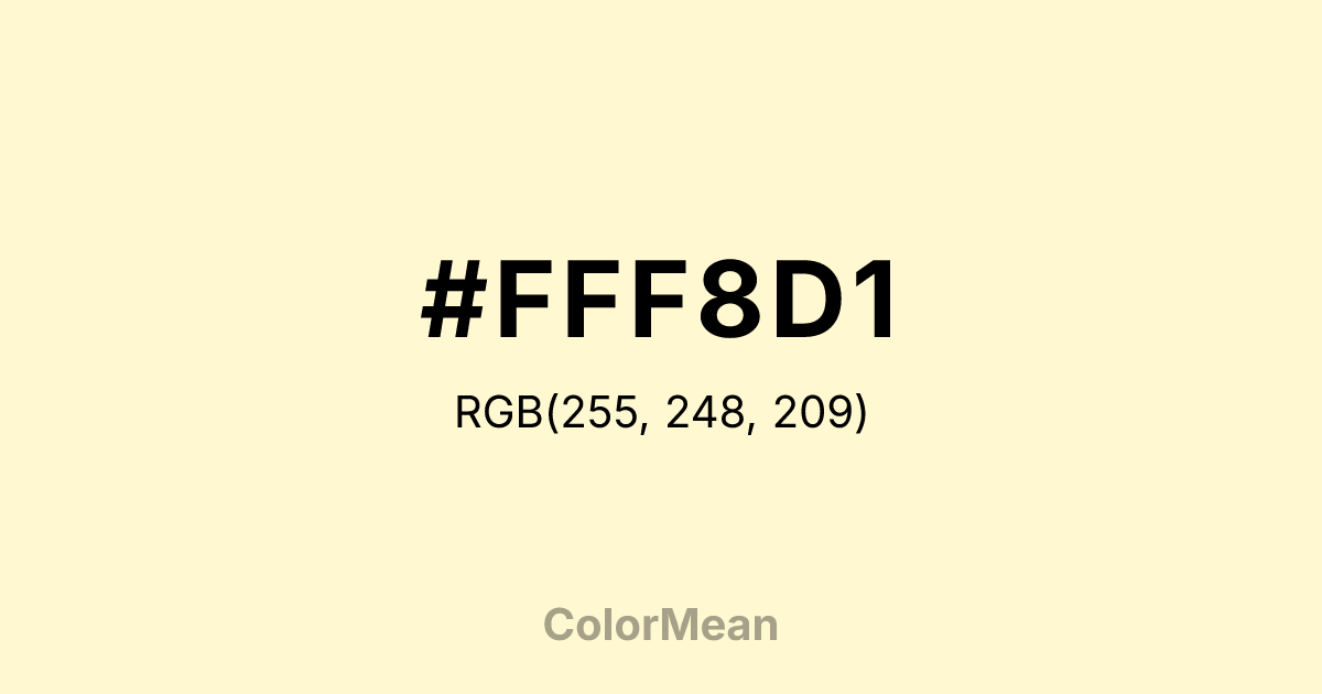 #FFF8D1 RGB value is (255, 248, 209). The hex color red value is 255, green is 248, and blue is 209. Its HSL format shows a hue of 51°, saturation of 100 percent, and lightness of 91 percent. The CMYK process values are 0 percent, 3 percent, 18 percent, 0 percent.