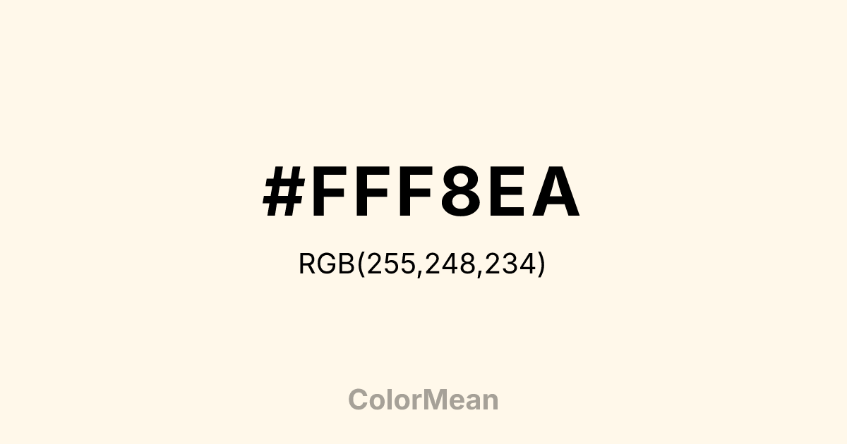 #FFF8EA RGB value is (255, 248, 234). The hex color red value is 255, green is 248, and blue is 234. Its HSL format shows a hue of 40°, saturation of 100 percent, and lightness of 96 percent. The CMYK process values are 0 percent, 3 percent, 8 percent, 0 percent.