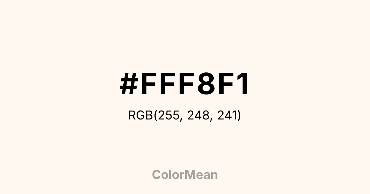 #FFF8F1 RGB value is (255, 248, 241). The hex color red value is 255, green is 248, and blue is 241. Its HSL format shows a hue of 30°, saturation of 100 percent, and lightness of 97 percent. The CMYK process values are 0 percent, 3 percent, 5 percent, 0 percent.
