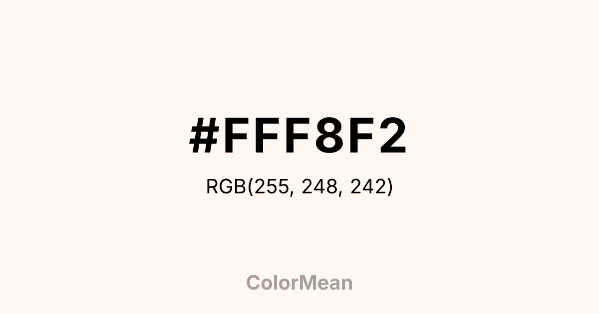 #FFF8F2 RGB value is (255, 248, 242). The hex color red value is 255, green is 248, and blue is 242. Its HSL format shows a hue of 28°, saturation of 100 percent, and lightness of 97 percent. The CMYK process values are 0 percent, 3 percent, 5 percent, 0 percent.