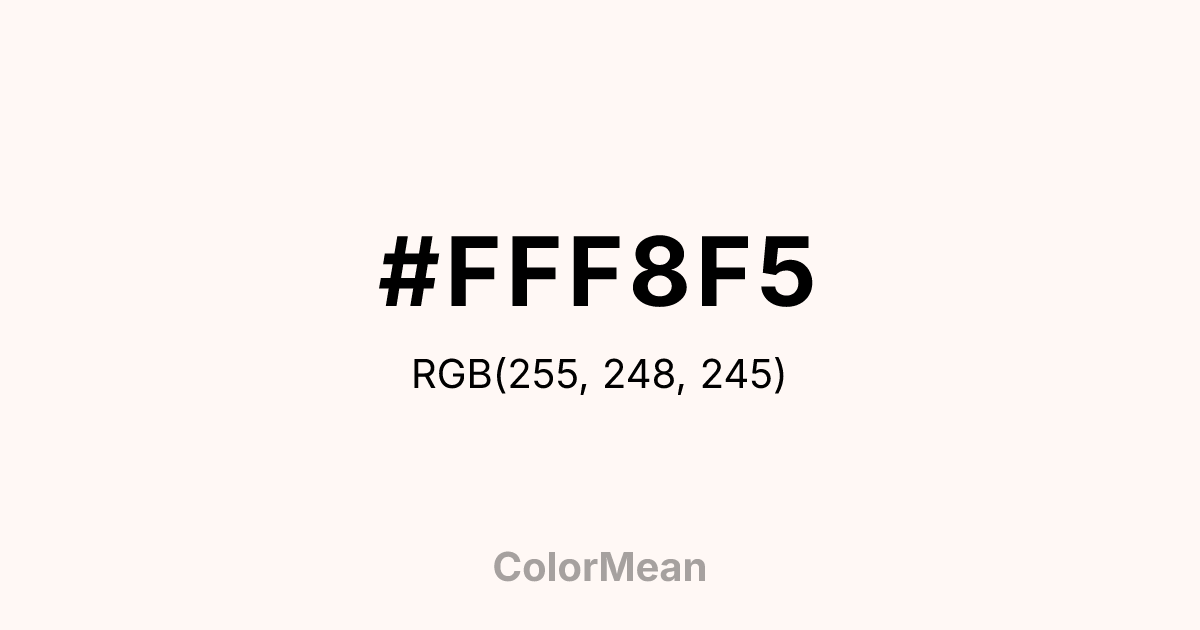 #FFF8F5 RGB value is (255, 248, 245). The hex color red value is 255, green is 248, and blue is 245. Its HSL format shows a hue of 18°, saturation of 100 percent, and lightness of 98 percent. The CMYK process values are 0 percent, 3 percent, 4 percent, 0 percent.