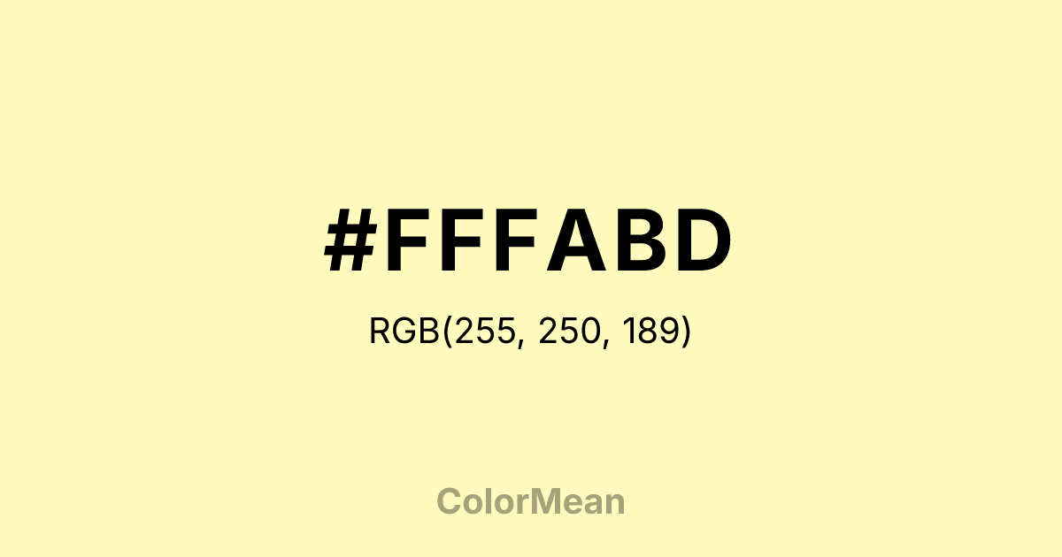 #FFFABD RGB value is (255, 250, 189). The hex color red value is 255, green is 250, and blue is 189. Its HSL format shows a hue of 55°, saturation of 100 percent, and lightness of 87 percent. The CMYK process values are 0 percent, 2 percent, 26 percent, 0 percent.