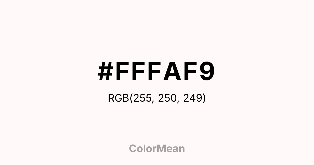 #FFFAF9 RGB value is (255, 250, 249). The hex color red value is 255, green is 250, and blue is 249. Its HSL format shows a hue of 10°, saturation of 100 percent, and lightness of 99 percent. The CMYK process values are 0 percent, 2 percent, 2 percent, 0 percent.